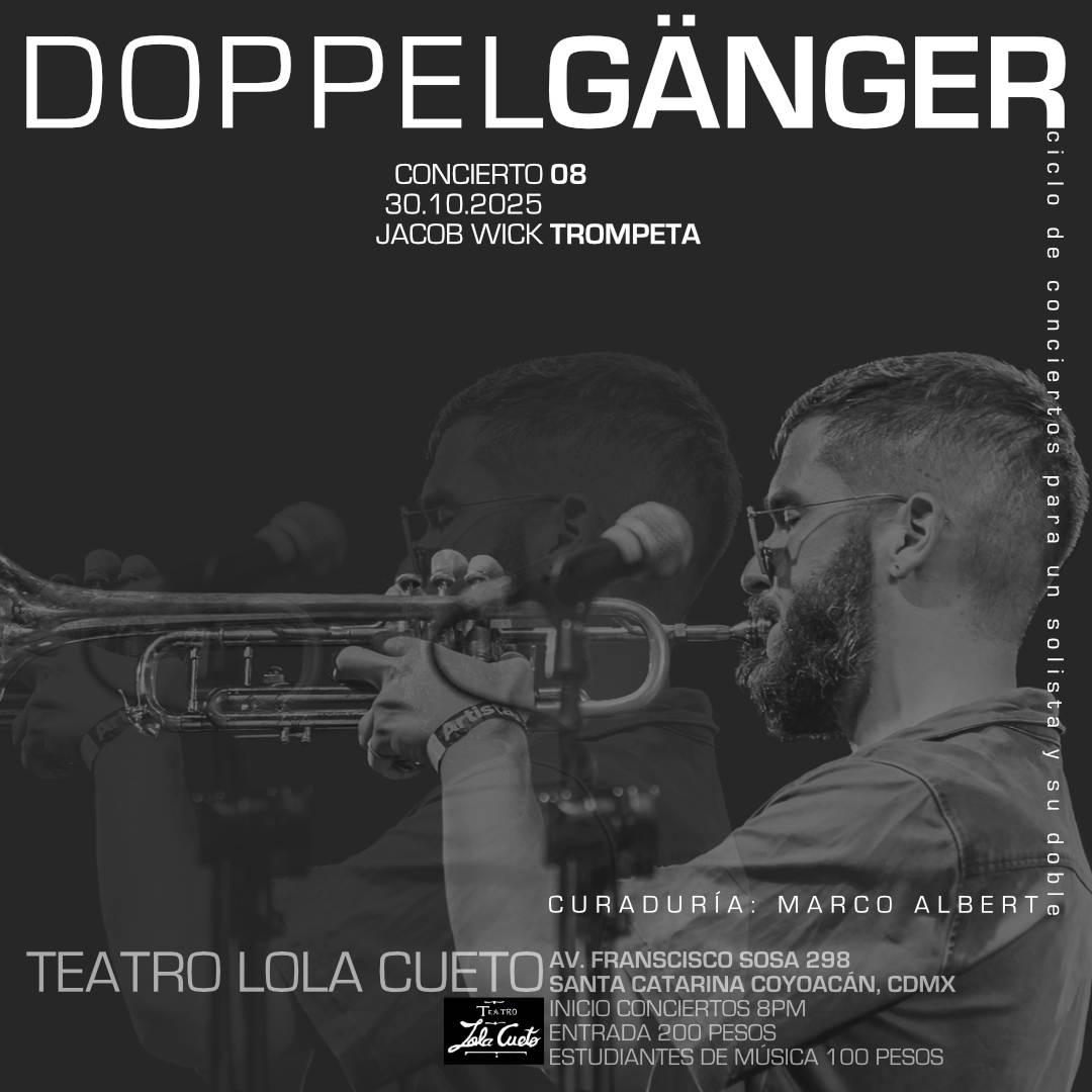 Viernes 10 de octubre de 2025, 20:00. Teatro Lola Cueto, CDMX. Con: Jacob Wick (trompeta). Entrada: MX$200. / Estudiantes de música: MX$100. Teatro Lola Cueto. Leer más