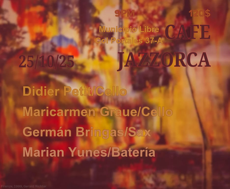 Sábado 25 de octubre de 2025, 21:00. Café Jazzorca, CDMX. Con: Didier Petit (cello), Maricarmen Graue (cello), Germán Bringas (saxofón) y Marian Leer más