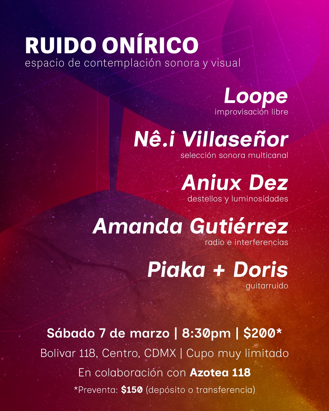 Sábado 7 de marzo, 20:30. Azotea 118, CDMX. Con: Loope, Nê.i Villaseñor, Aniux Dez, Amanda Gutiérrez, Piaka + Doris. Entrada:
