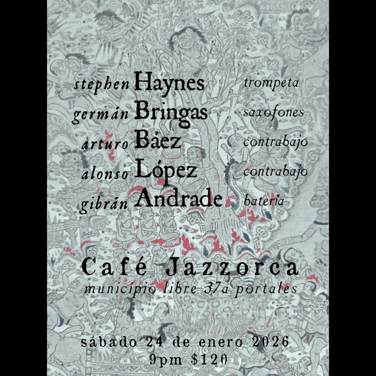 Haynes en Jazzorca Ricardo Lomnitz 20/01/2026 Sábado 24 de enero de 2026, 21:00. Café Jazzorca, CDMX. Con: Stephen Haynes (trompeta), Germán Bringas (saxofón), Arturo Báez (contrabajo), Alonso López (contrabajo) y Gibrán Andrade (batería). Entrada: MX$120. Share this...FacebookPinterestTwitterLinkedin