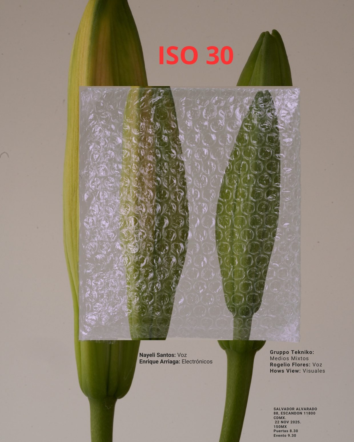 Con: Nayeli Santos (voz), Enrique Arriaga (electrónicos), Gruppo Tekniko (medios mixtos), Rogelio Flores (voz) y Hows View (visuales).