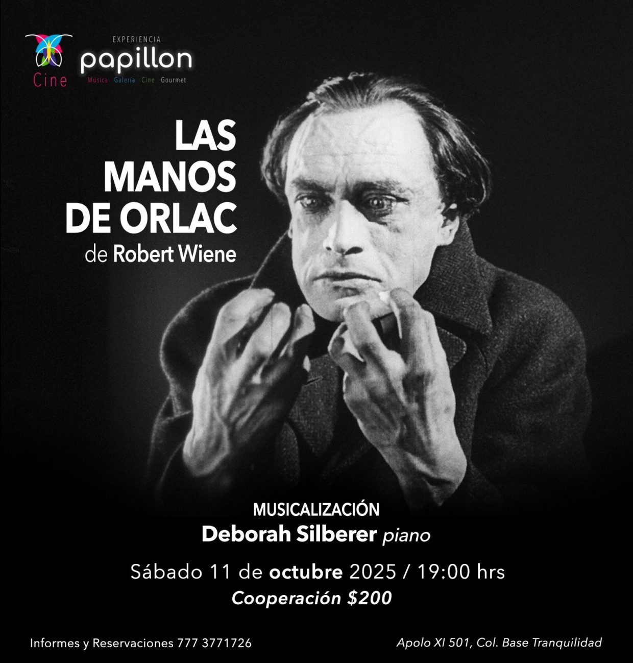 Las Manos de Orlac Ricardo Lomnitz 09/10/2025 Sábado 11 de octubre de 2025, 19:00. Cine Papillon, Cuernavaca. Musicalización por Deborah Silberer (piano). Entrada: MX$200. Cine Papillon. Apolo XI 501, Col. Base Tranquilidad. Cuernavaca. Share this...FacebookPinterestTwitterLinkedin