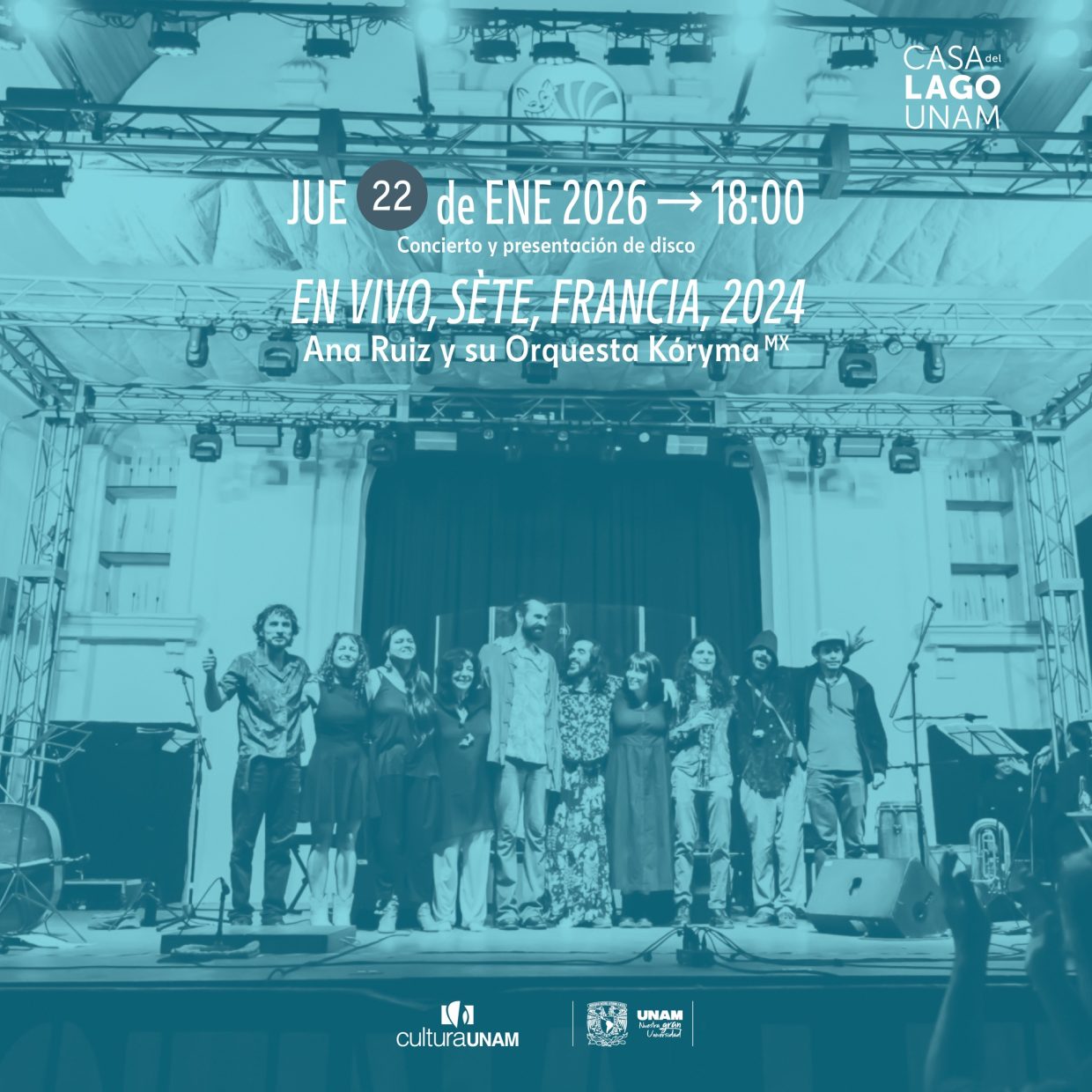 Orquesta Kóryma: Concierto y presentación de disco Ricardo Lomnitz 18/01/2026 Jueves 22 de enero de 2026, 18:00. Casa del Lago, CDMX. Con Ana Ruiz y su Orquesta Kóryma. Entrada libre. Casa del Lago. Bosque de Chapultepec, Primera Sección. San Miguel Chapultepec, Miguel Hidalgo, CDMX. Share this...FacebookPinterestTwitterLinkedin