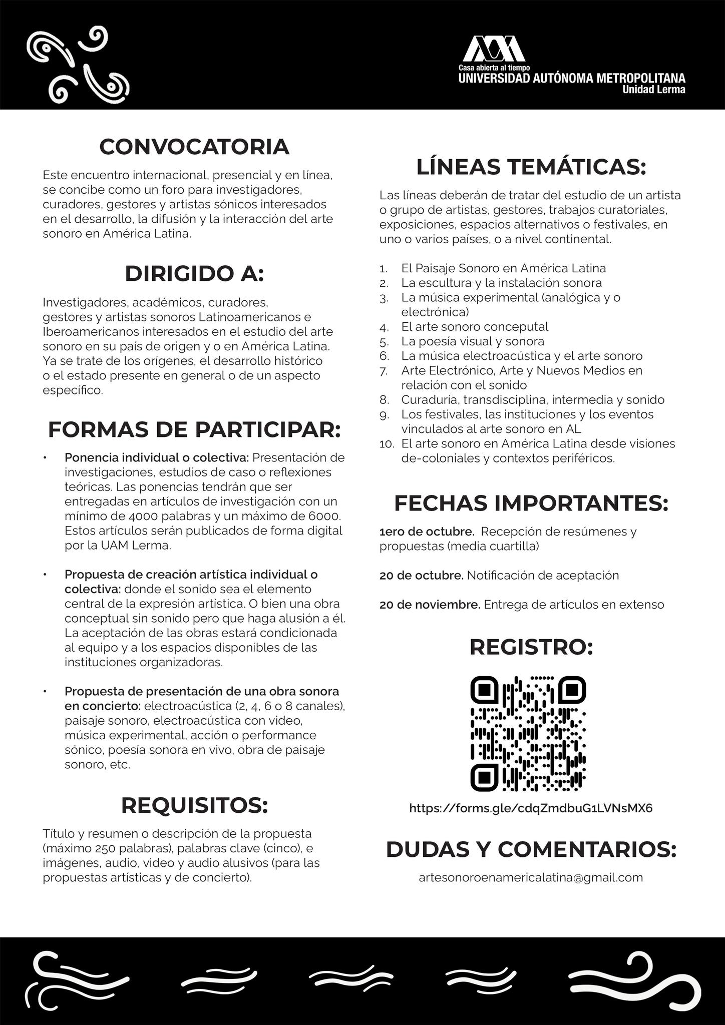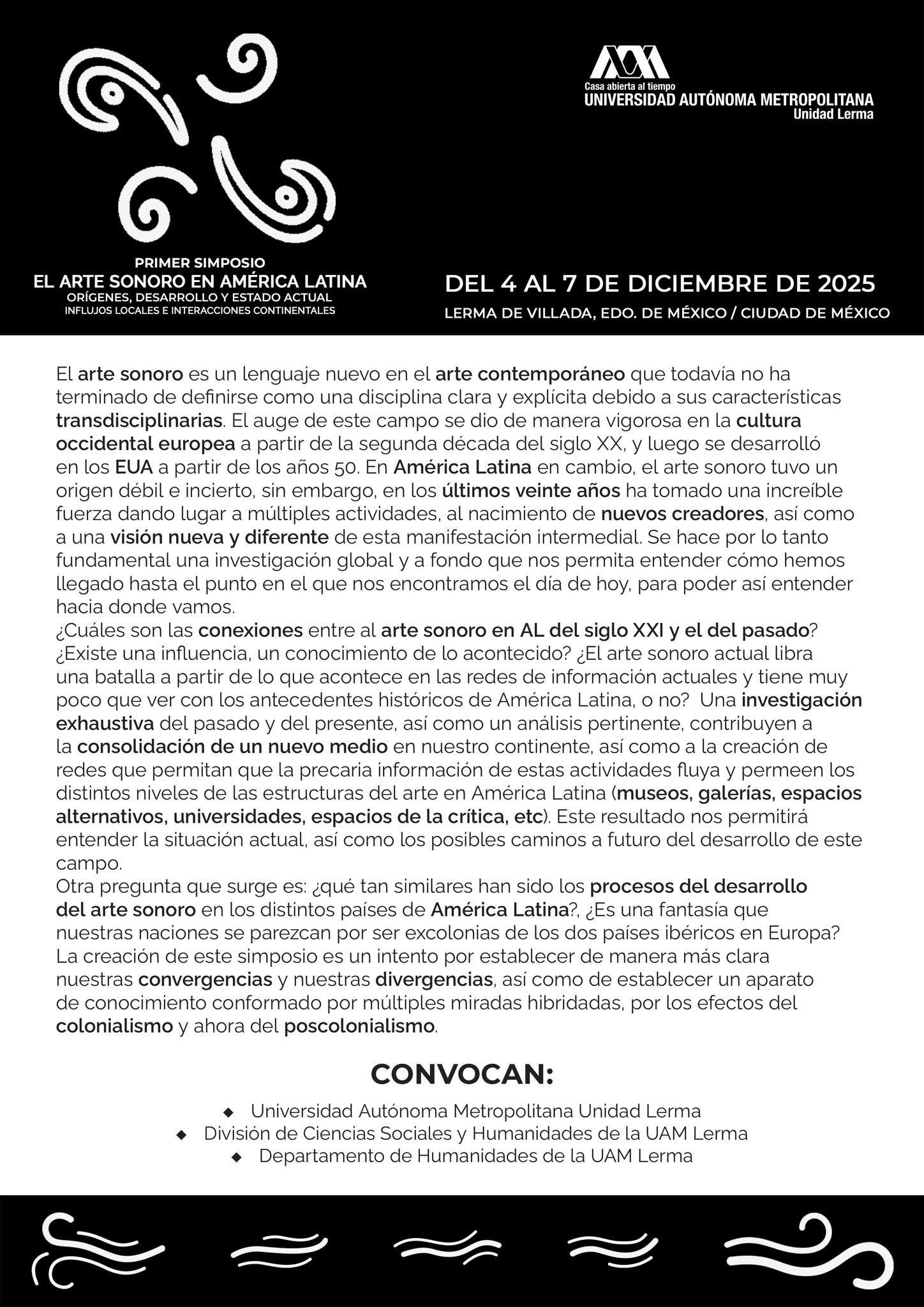 Este encuentro internacional, presencial y en línea, se concibe como un foro para investigadores, curadores, gestores y artistas sónicos interesados en el desarrollo la difusión y la interacción del arte sonoro en América Latina.