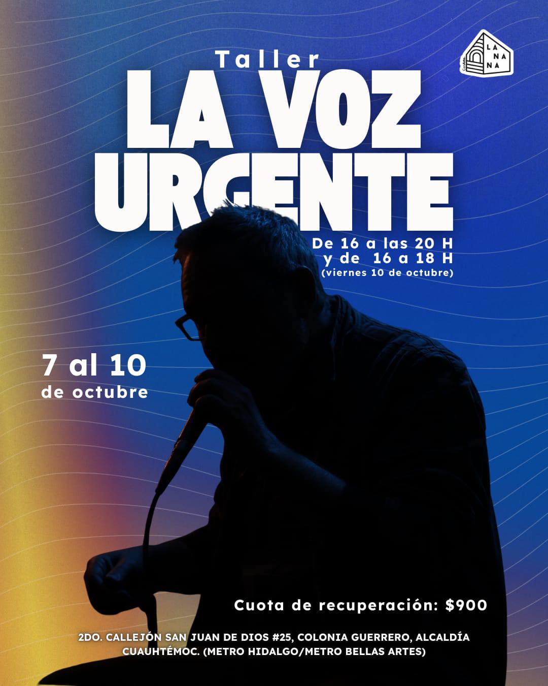 Taller La Voz Urgente Ricardo Lomnitz 01/10/2025 Del 7 al 10 de octubre de 2025, 16:00 a 20:00. La Nana, CDMX. Imparte Marco Albert. Costo: MX$900. La Nana. 2do Cajjelón San Juan de Dios #25, colonia Guerrero. Cuauhtémoc, CDMX. Share this...FacebookPinterestTwitterLinkedin