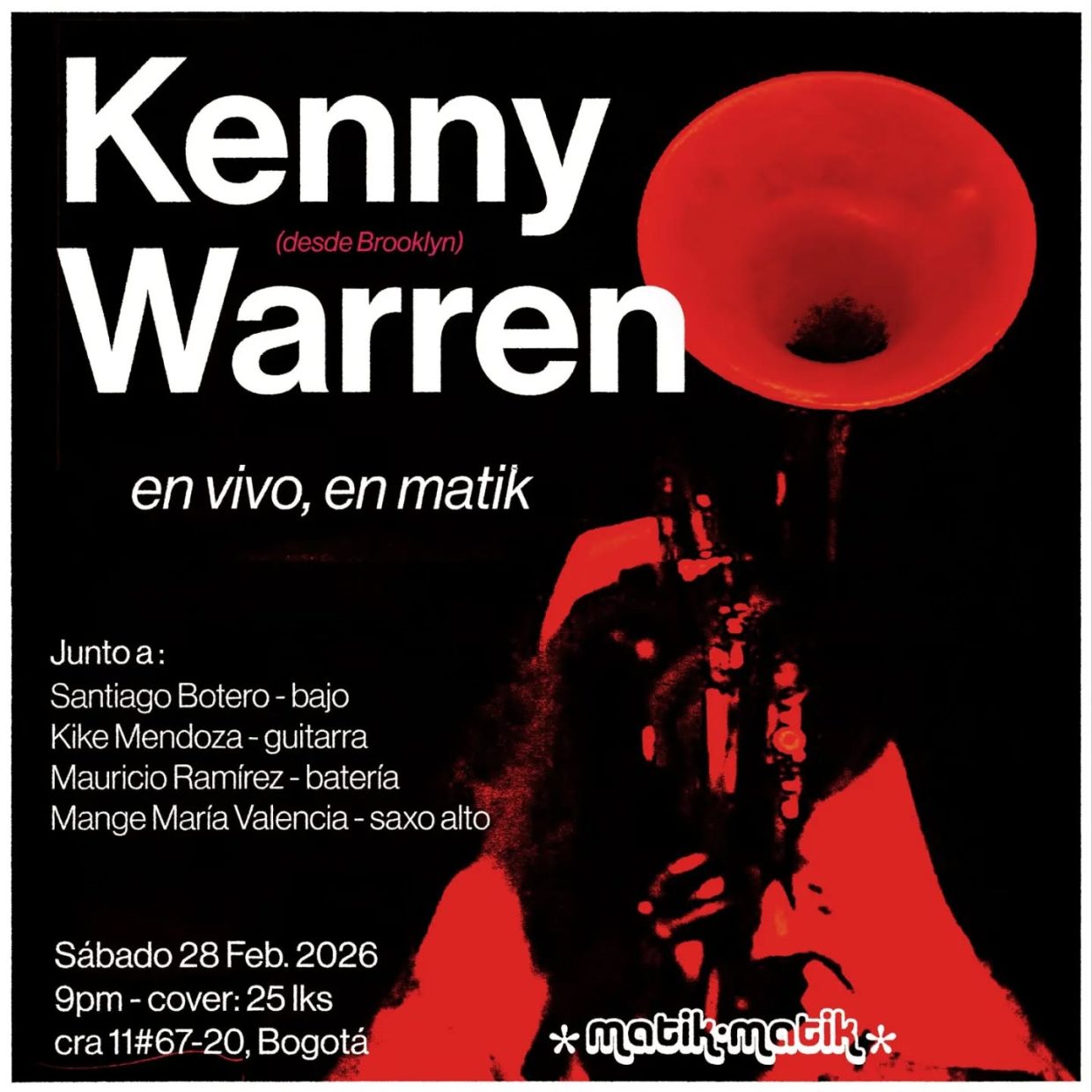 Con: Kenny Warren (trompeta), Santiago Botero (bajo), Kike Mendoza (guitarra), Mauricio Ramírez (batería) y Mange María Valencia (saxo alto).