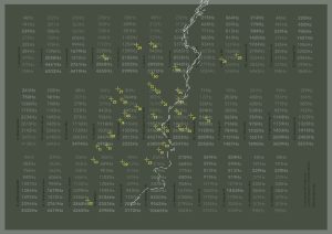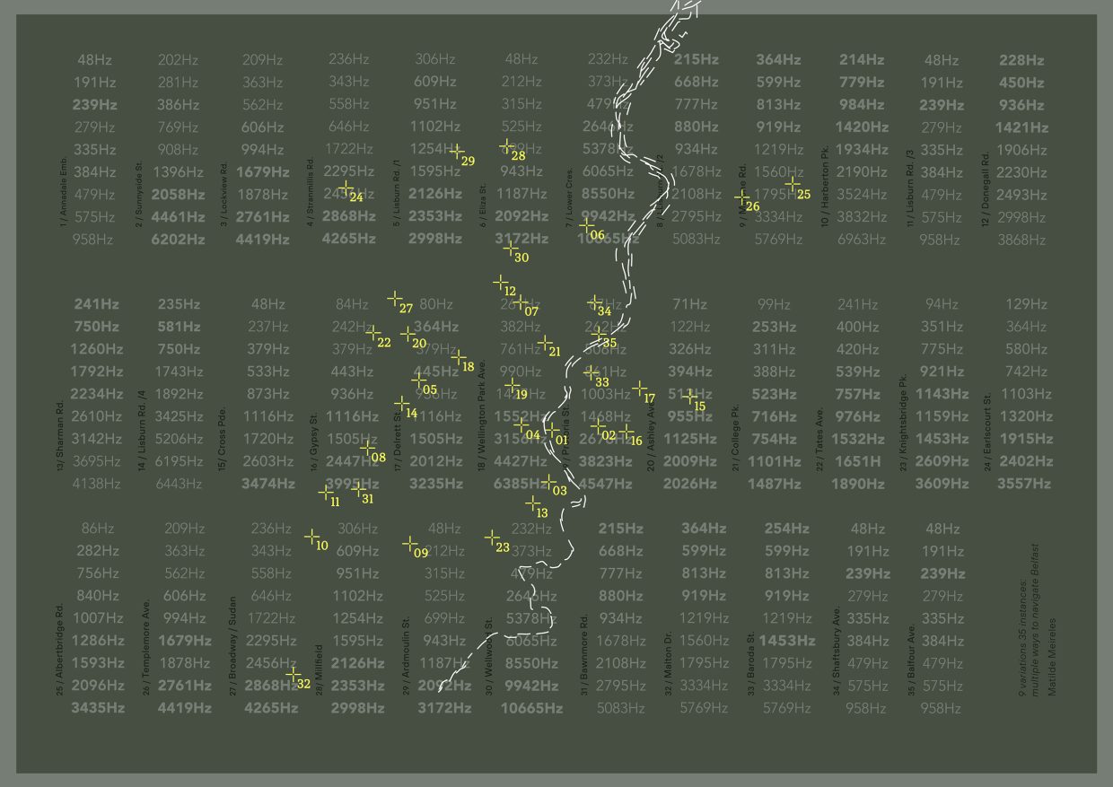 El mapa-partitura “9 variations 35 instances” reúne los sonidos de 35 transformadores eléctricos, posicionándolos en relación al río Lagan. Fuente: Matilde Meireles. https://matildemeireles.com/